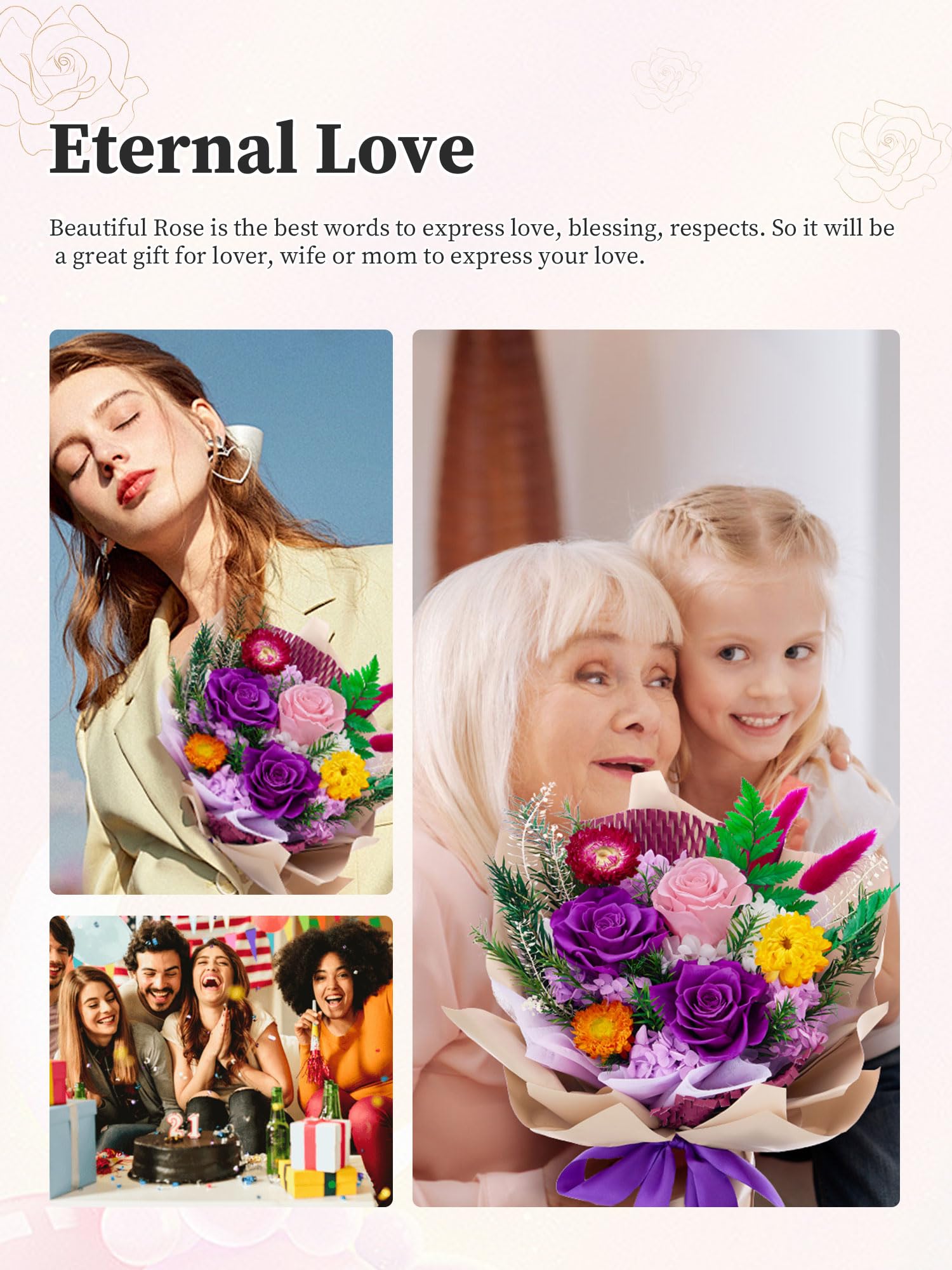 - 【Forever Flowers Purple】These roses are carefully selected at the height of their splendor and preserved through innovative methods. They continue to radiate the same enchanting beauty they possessed the moment they were picked. Unlike regular flowers that wilt and fade, Rose long lasting that last over a year. A truly timeless and stunning bouquet that defies the passage of time.